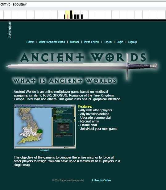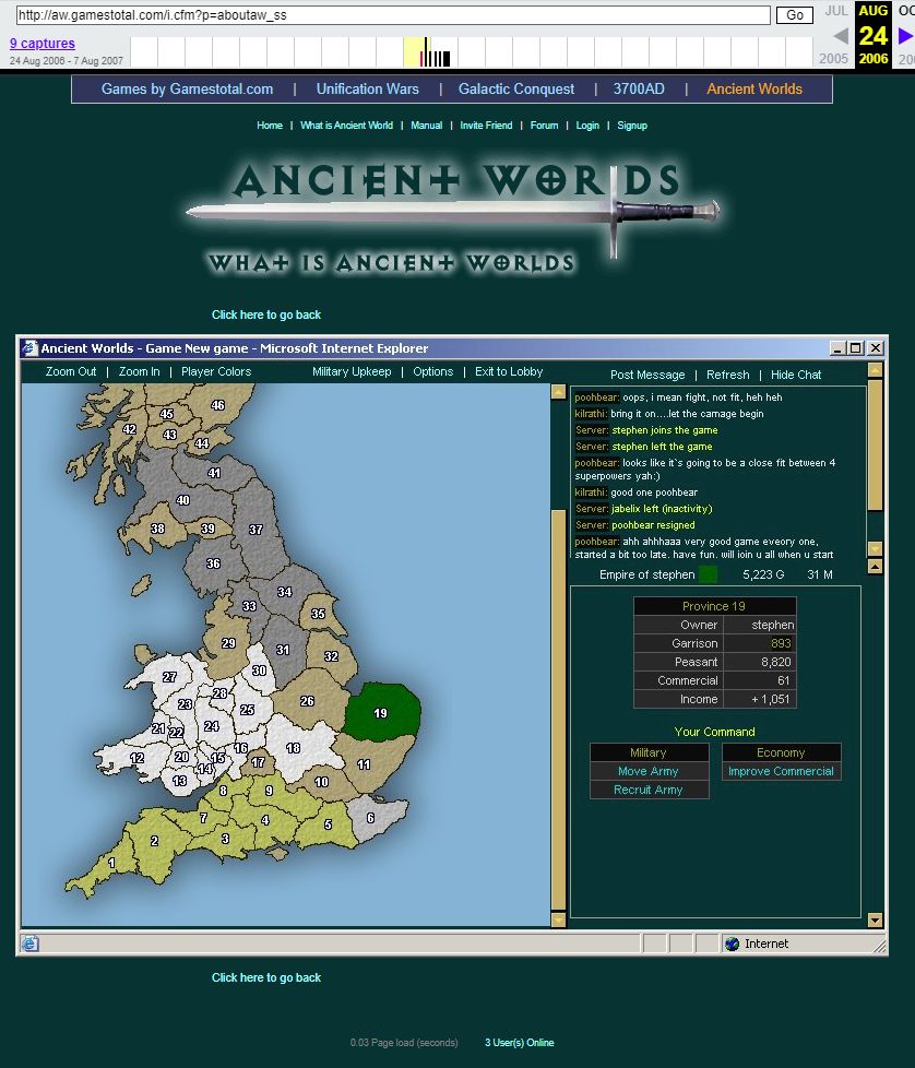 Stephen designed Ancient worlds so be a game similar to RISK played similar to a board game that supports up to 60 players in a single game. Expanding on games similar to RISK, Stpehen added various exra features such as Peasant count , when you recruit troops for war the peasant count will drop , commercial strength , income and garrison of that provience.